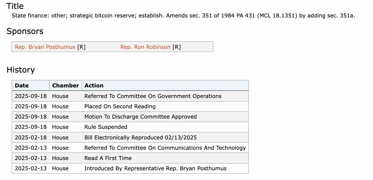 密歇根州比特币储备法案HB 4087于9月19日迎来自2月以来的首次进展,该法案已推进至众议院二读阶段并提交政府运营委员会审议。根据法案内容,州政府可将不超过10%的州资金配置于加密货币资产。